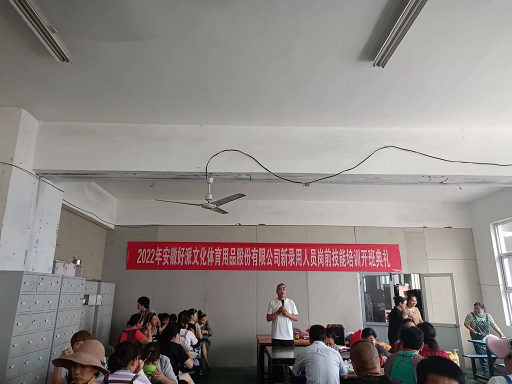 圖為安徽好派文化體育用品有限公司開班典禮人社局領(lǐng)導(dǎo)現(xiàn)場講話